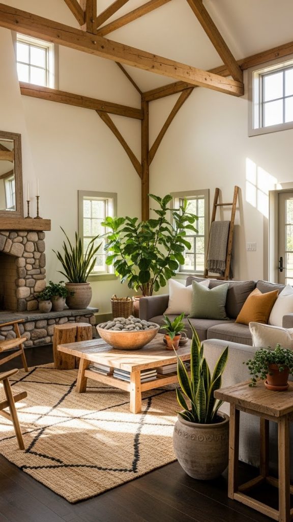 Greenery adds life and freshness to rustic interiors. Potted plants, hanging planters, or simple vases with greenery can brighten any room. Choose low maintenance plants with natural shapes rather than overly decorative arrangements.