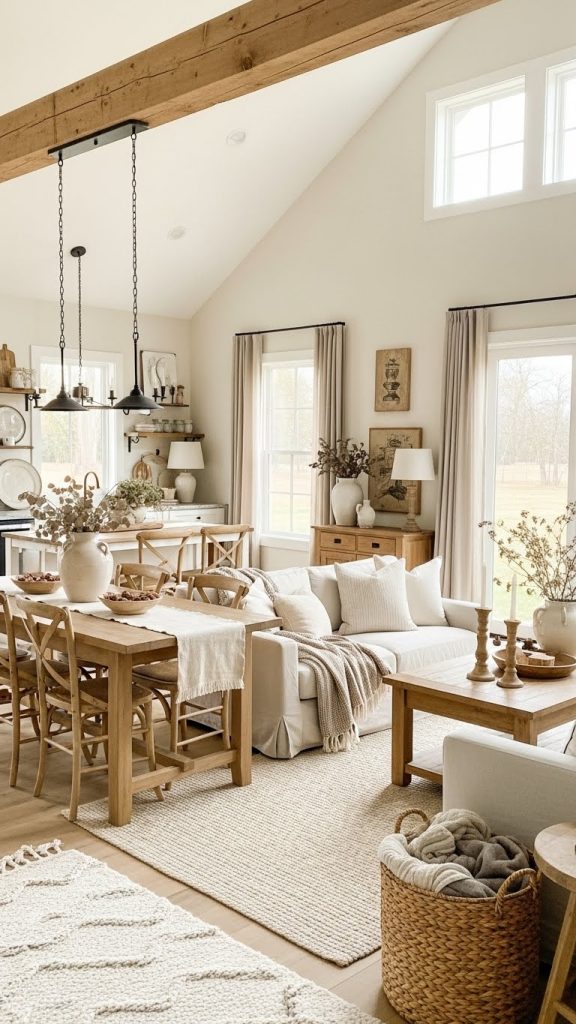 A large wooden dining table is a centerpiece in barn inspired homes. Paired with benches or simple chairs, it creates a welcoming space for gatherings. In the living room, opt for a wooden coffee table with a weathered finish and comfortable upholstered seating.