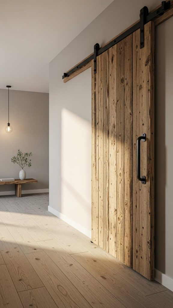 These doors work well for separating living areas, bathrooms, bedrooms, or home offices. Wood doors with visible grain, metal hardware, and matte finishes enhance the rustic charm. Neutral tones like natural wood, whitewash, or soft gray are ideal for a balanced look.