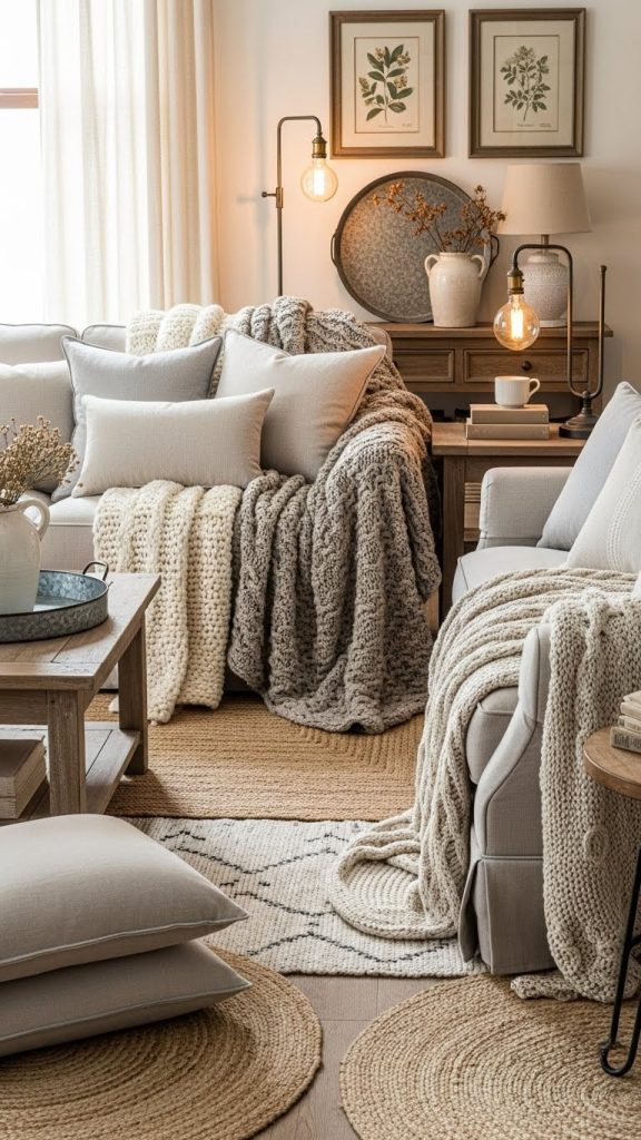 Use linen or cotton curtains in neutral shades to keep rooms light and airy. Throw blankets made from wool, knit, or woven materials add texture and warmth, especially in living rooms and bedrooms. Area rugs with subtle patterns or natural fibers like jute or wool help define spaces and add softness underfoot.