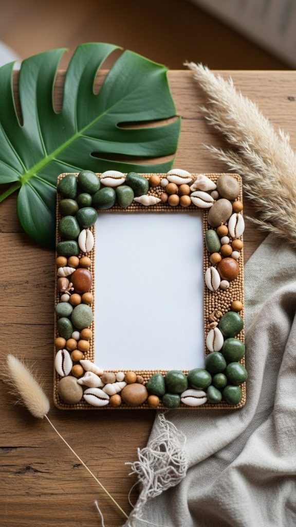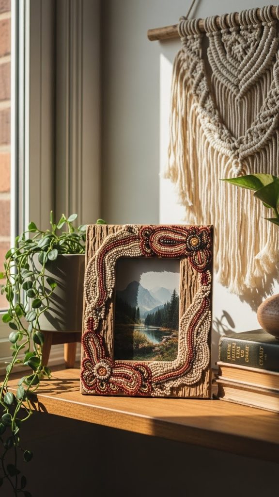 Nature inspired beaded frames bring organic beauty indoors. Use beads made from natural stones, shells, seeds, or wood. Earthy colors such as green, brown, tan, and muted blues work best for this style.