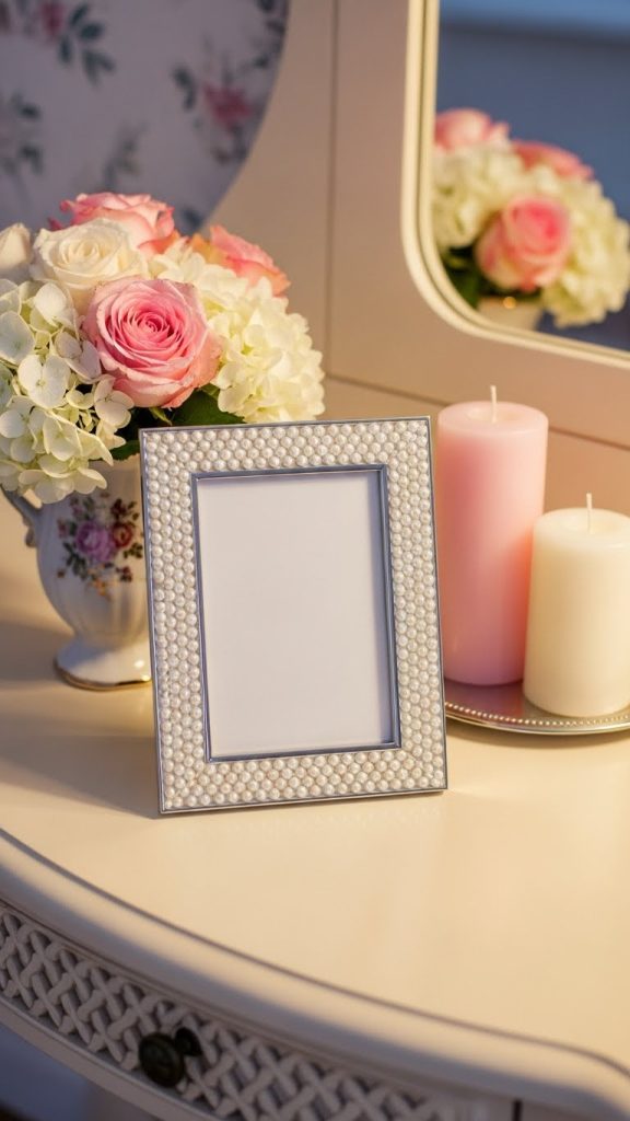 Choose a frame with clean lines and carefully glue pearl beads along the borders. You can keep the design simple with one layer of pearls or add multiple rows for a more dramatic effect. White or ivory pearls are classic, but soft blush or champagne tones can add a modern twist.