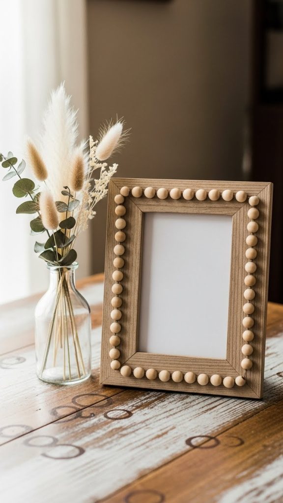 A classic wooden beaded frame is timeless and versatile. Start with a simple wooden photo frame and choose round wooden beads in natural tones. These beads can be left raw or lightly stained to enhance the grain of the wood. Arrange the beads evenly along the edges of the frame, gluing them carefully for a neat finish.