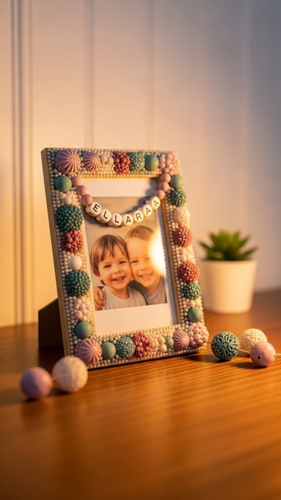 A personalized beaded frame adds a meaningful and custom touch. Use letter beads to spell out names, dates, or short words along the frame. Combine them with decorative beads that match the color scheme.