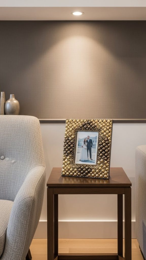 You can combine metallic beads with neutral base frames for a balanced look. For a bold statement, cover the entire frame with metallic beads arranged symmetrically.