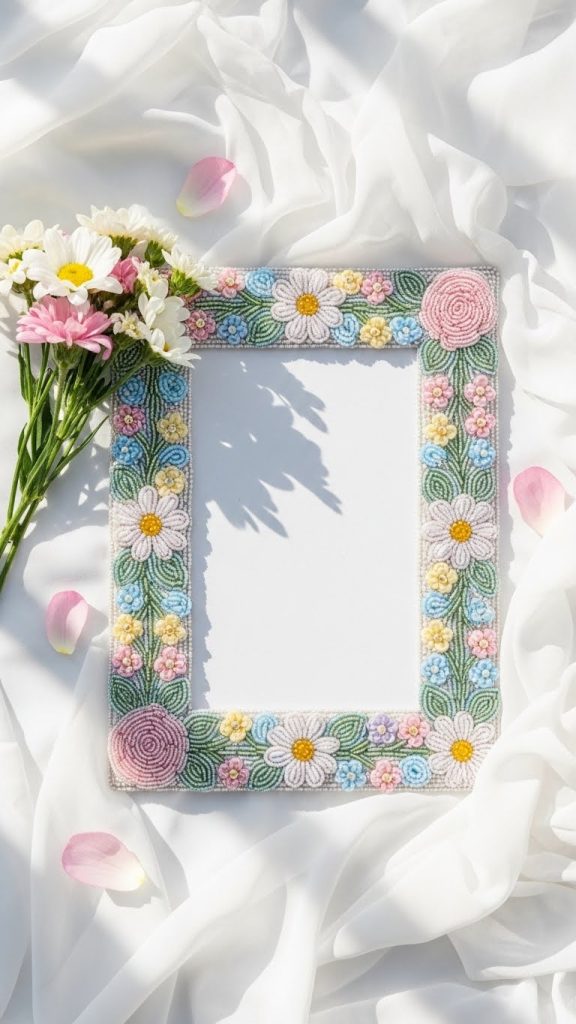 Vintage beaded frames evoke a sense of nostalgia and charm. Choose muted colors like dusty rose, sage green, soft blue, and antique white. Glass beads with a slightly worn or matte finish work especially well.