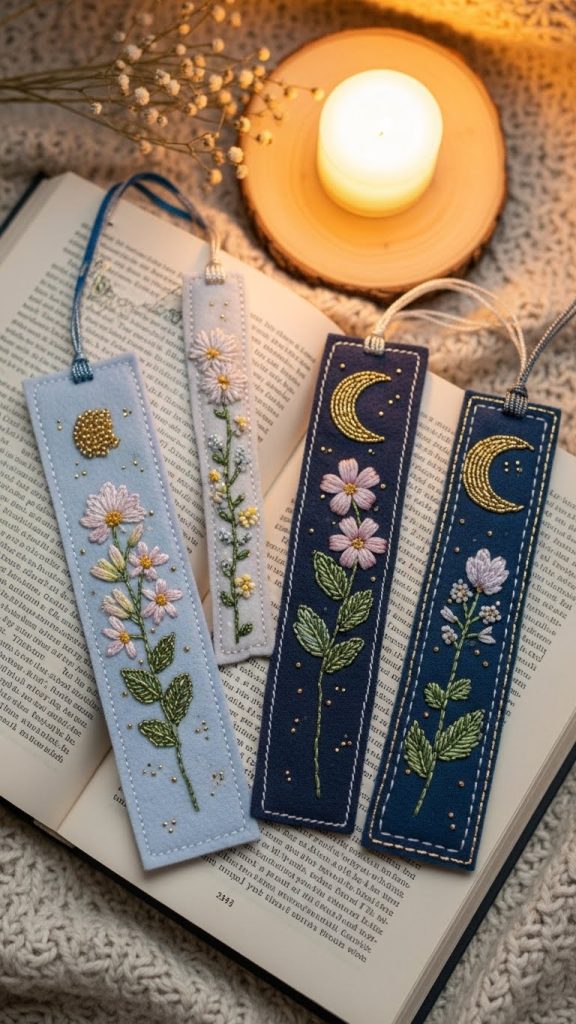Bookmarks can be embroidered on felt or fabric strips and decorated with beads along the edges or within the design. Popular themes include flowers, stars, initials, or inspirational symbols.