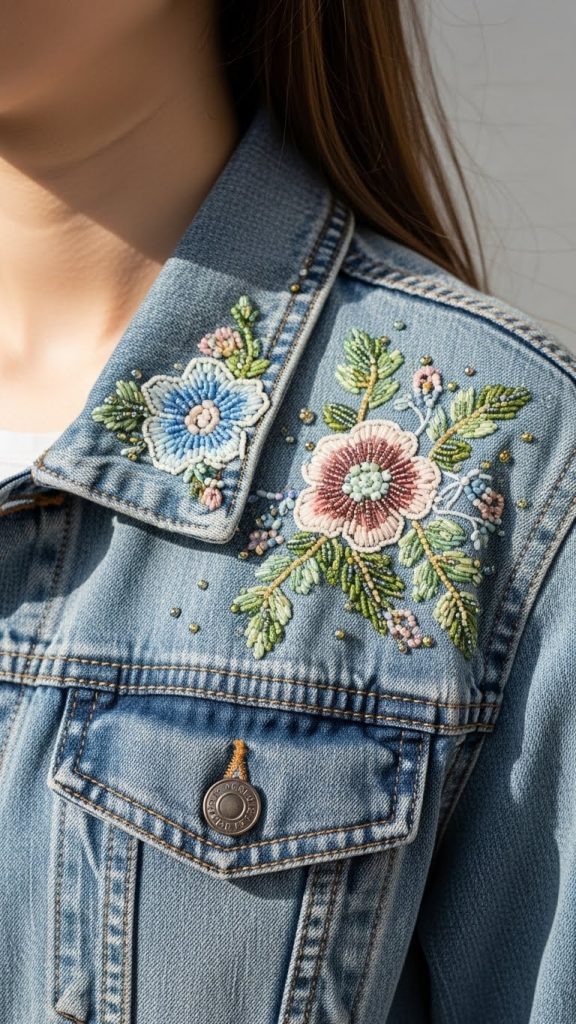 Popular areas for beaded embroidery include collars, cuffs, pockets, shoulders, and hemlines. You can embellish denim jackets, blouses, dresses, or even jeans. Floral motifs, geometric patterns, and celestial designs work especially well for clothing embellishment.