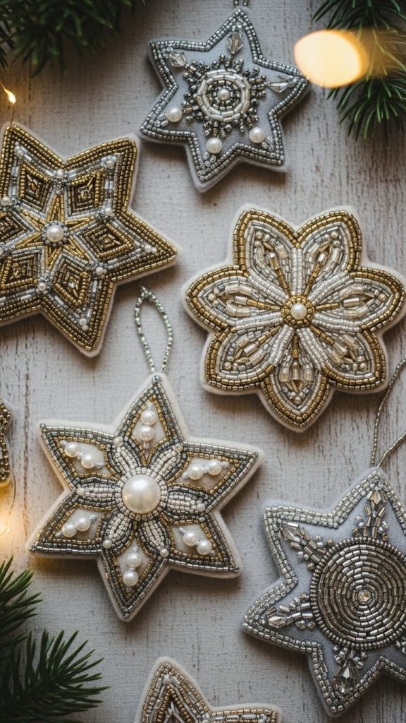 Ornaments are often stitched on felt and shaped into stars, hearts, flowers, or symbolic motifs. Beads add sparkle and elegance, making them stand out on trees or decorative displays.