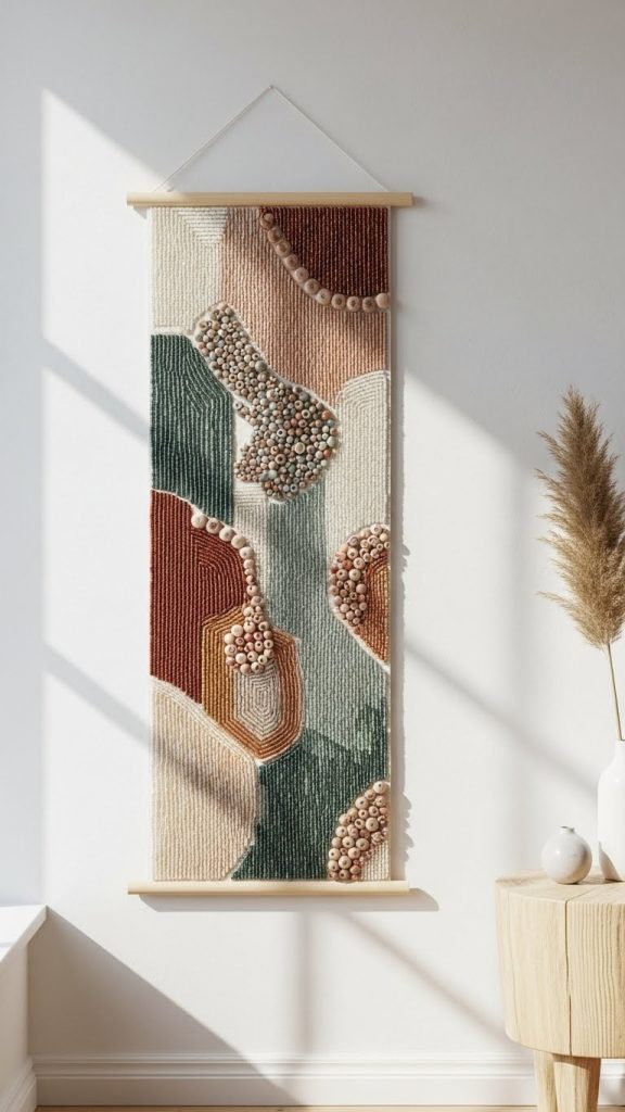 Wall hangings can be framed, mounted on wooden dowels, or displayed in hoops. Neutral color palettes create modern minimalist art, while bold colors result in bohemian or eclectic pieces.
