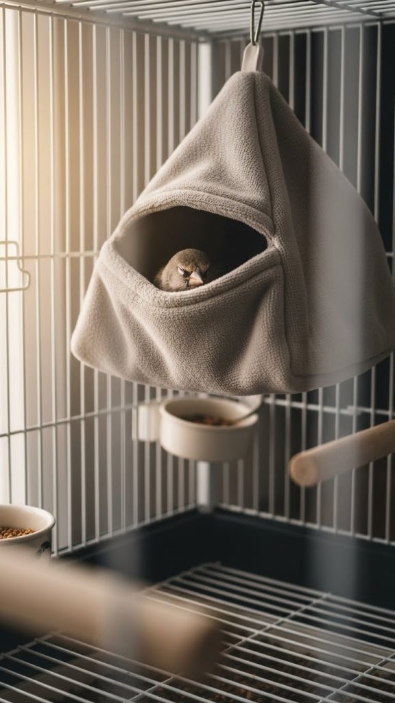 Use a bird safe fabric hut or a covered sleeping perch placed in a quiet corner of the cage. Choose neutral or pastel colors that complement your overall decor. Make sure the fabric is breathable and easy to clean.