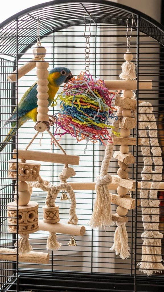 Rotate toys regularly to keep the cage fresh and interesting. Wooden chew toys, paper shredders, and rope toys in coordinated colors can look beautiful while keeping your bird engaged.