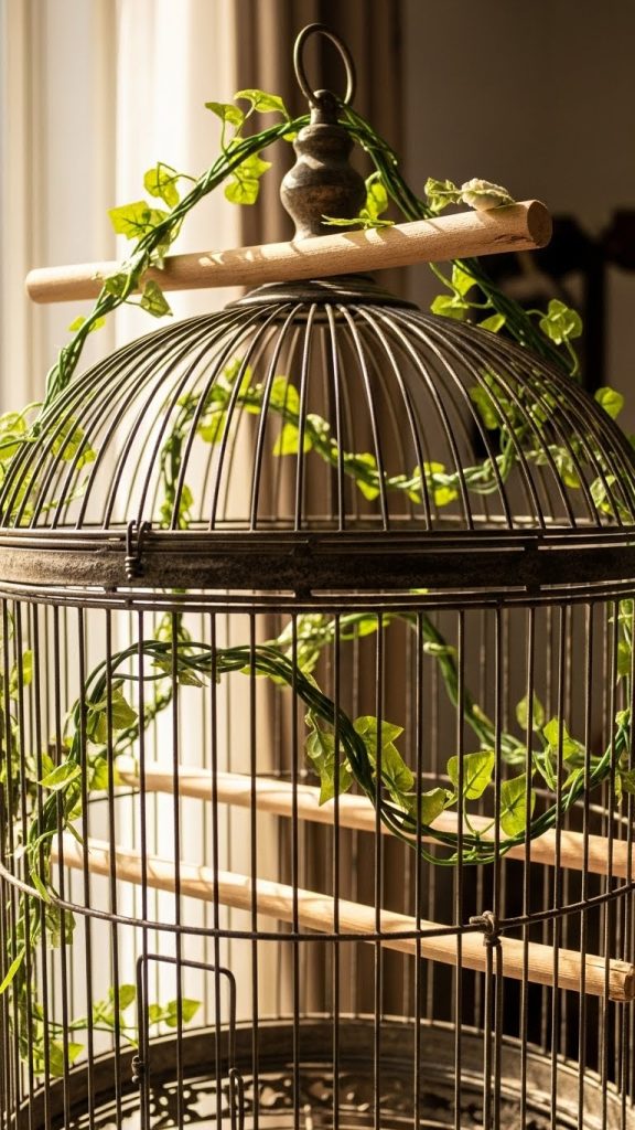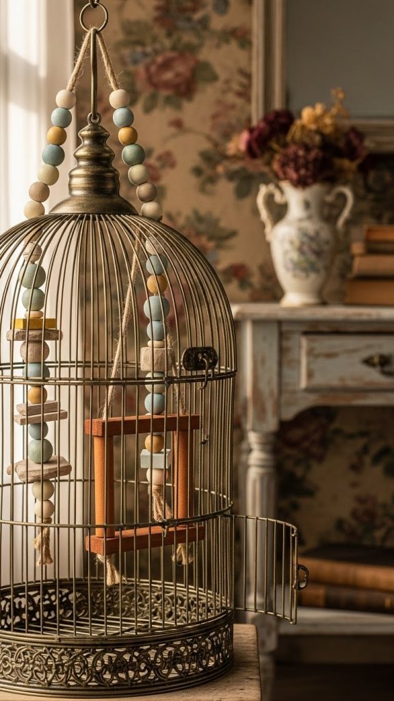 Choose accessories with muted colors, distressed finishes, or classic shapes. Simple metal food cups, wooden beads, and traditional swings create an old world feel. You can even place the cage near vintage frames or shelves to enhance the look.