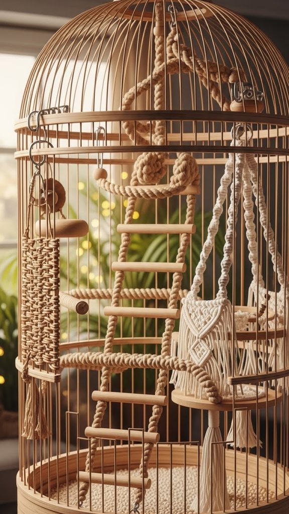 Use rope perches, woven ladders, and hanging toys made from jute or cotton. Choose earthy colors such as beige, tan, soft green, and muted terracotta. You can even add a small macrame style swing for visual interest.