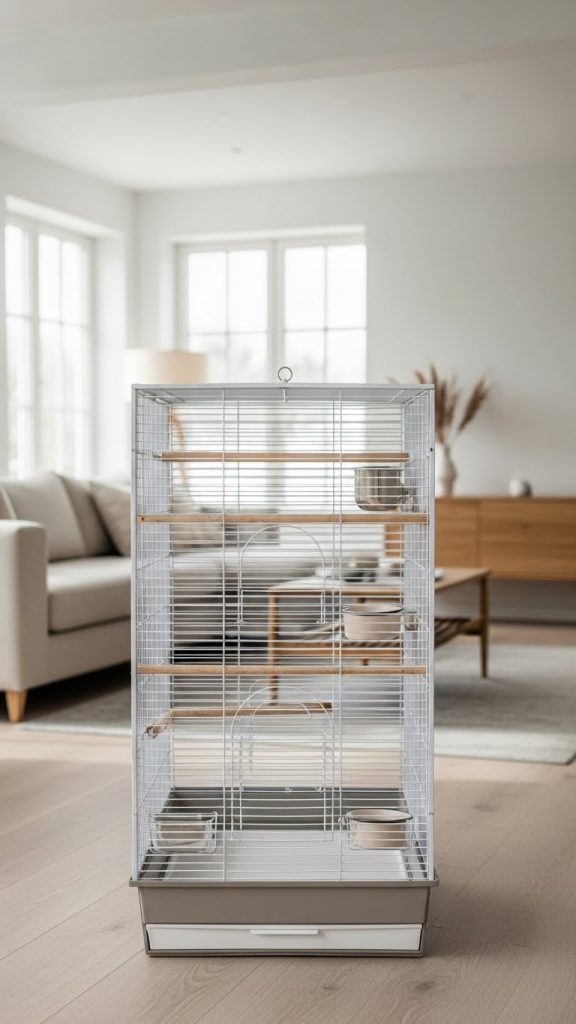 Choose a sleek cage design in white, black, or soft gray. Use a limited number of high quality accessories such as simple wooden perches, neutral toned food bowls, and a single understated swing. Avoid overcrowding the cage, allowing open space for your bird to move comfortably.