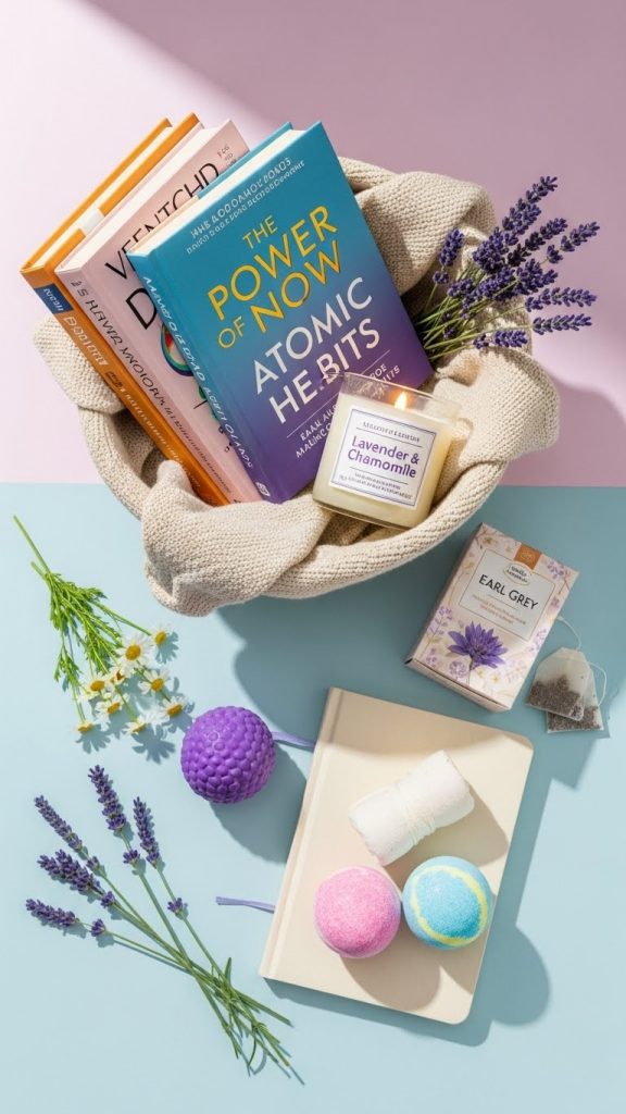 Books about self-care, wellness, or mindfulness make a wonderful addition to a basket aimed at relaxation and personal growth. Pair your book selection with calming items like a journal, a scented candle, herbal teas, bath bombs, or a stress ball. This basket is ideal for someone who enjoys quiet reflection or is looking to incorporate more mindfulness into their daily routine.