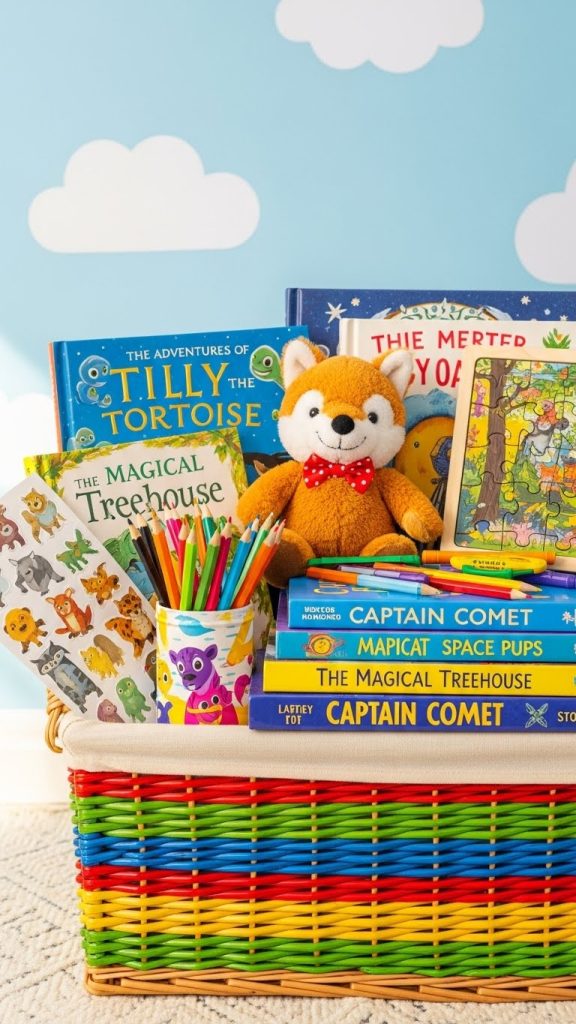 A book basket exchange is not just for adults; it can also delight children. Curate a basket with picture books, early readers, or chapter books depending on the child’s age. Add playful items like a plush toy, stickers, colored pencils, or a small puzzle. You can even include a personalized reading chart to encourage daily reading. This type of basket encourages reading as a fun and interactive experience for kids.