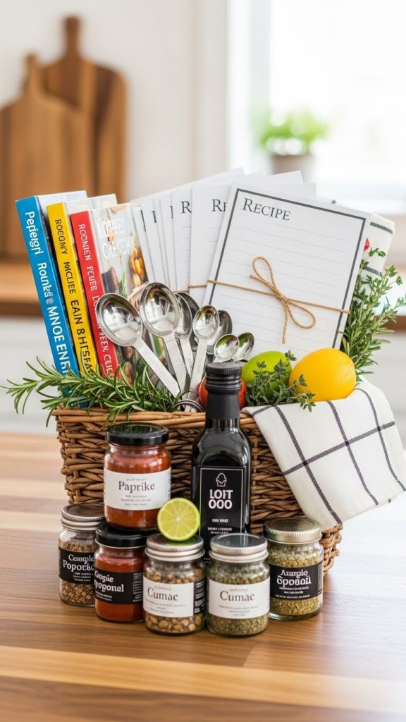 Food lovers will delight in a cookbook basket exchange. Include one or two cookbooks or culinary guides tailored to the recipient’s interests. Pair them with kitchen gadgets, measuring spoons, recipe cards, or gourmet spices. You can even add small, non-perishable ingredients like specialty salts, teas, or chocolate. This type of basket is perfect for a friend who loves to experiment with new recipes or explore different cuisines.