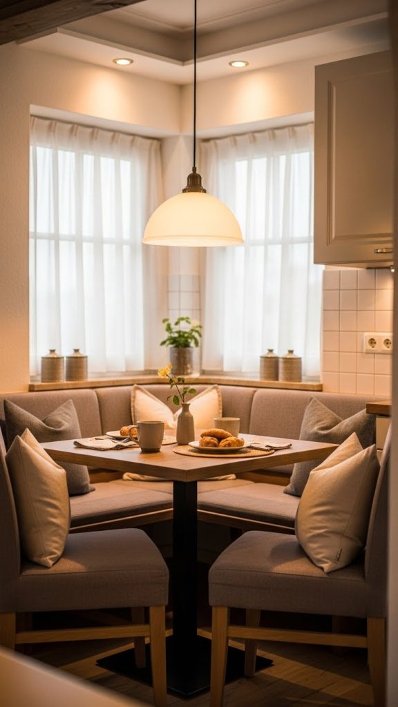 A cozy corner breakfast nook instantly makes a home feel warmer. Place a small table in a corner and add two cushioned chairs for extra comfort. Soft upholstery in neutral or pastel shades creates a welcoming atmosphere.