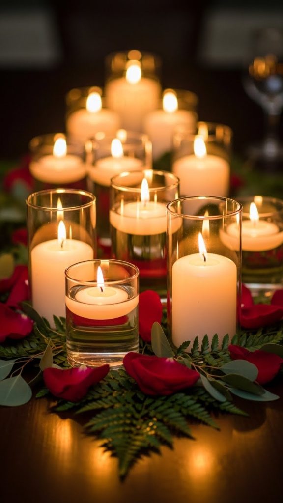 For a soft and elegant look, place candles inside clear glass holders and surround them with scattered rose petals or small greenery branches. Floating candles in a bowl of water with petals or glass beads create an enchanting glow. For a modern look, mix candles of different heights on mirrored trays. The reflection of the candlelight adds extra sparkle and depth to the table.