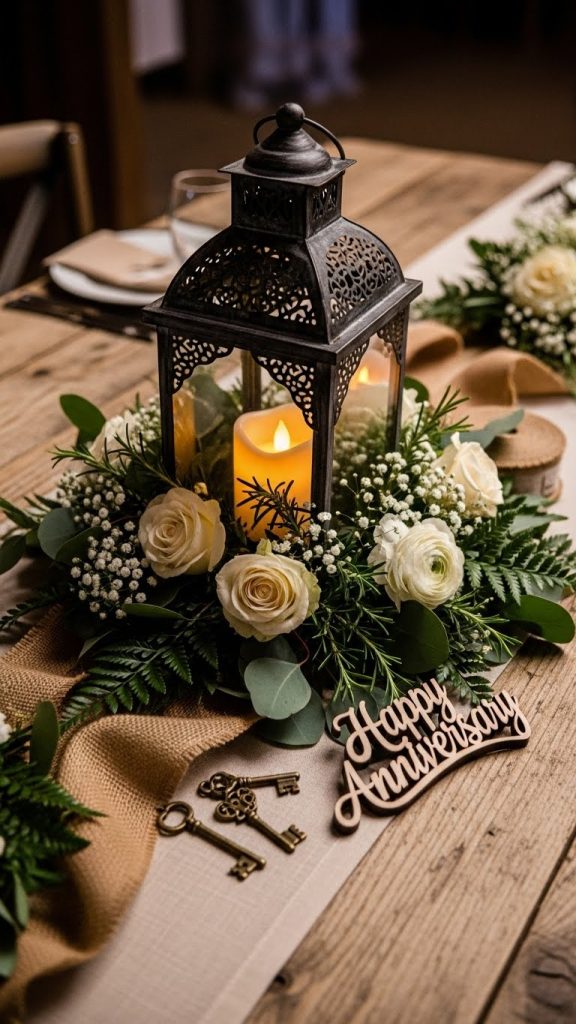 Vintage lanterns are one of the most versatile centerpiece ideas, especially for rustic, farmhouse, garden, or vintage themed anniversary celebrations. They bring charm, character, and a touch of nostalgia to the table.