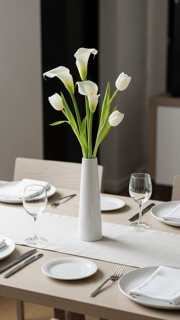 For a minimalist look, use a single statement vase with one type of flower, such as calla lilies, tulips, or orchids. Another option is to use a geometric vase with simple greenery like eucalyptus. You can also create minimalist candle arrangements using clear holders and straight lines.