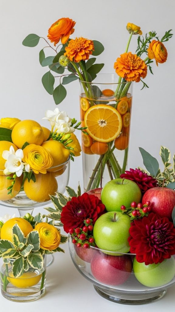 You can place fruits inside clear bowls, scatter them around a floral arrangement, or use them inside tall vases with flowers on top. This style brings a natural and refreshing feel to the table.