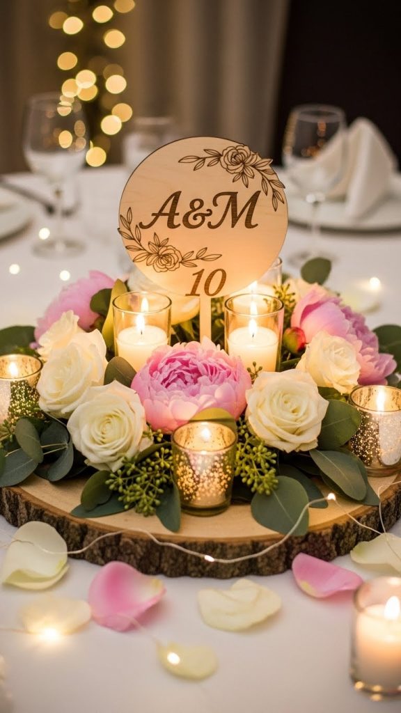 Nothing makes a centerpiece more meaningful than adding personal elements unique to the couple. This idea allows you to highlight their names, wedding date, anniversary number, or meaningful quotes that define their journey.