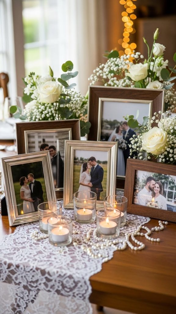 To create this type of centerpiece, choose photos from different moments in the couple’s relationship. Include wedding pictures, travel memories, special milestones, and candid everyday moments. Display these photos in small frames and place them around a floral arrangement or candle setup. You can also place photos on mini easels or clip them to branches placed inside a vase.