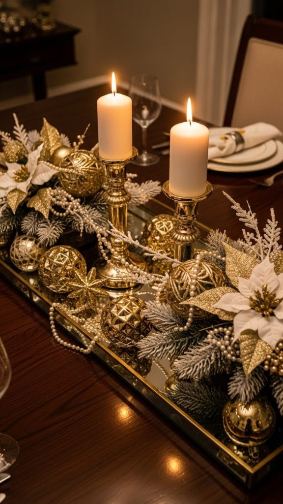 Start with a gold tray or mirrored base. Add white candles in glass holders or gold candle stands. Surround them with gold ornaments, pearl garlands, or white poinsettias. To add texture, incorporate frosted pine branches or faux winter leaves.