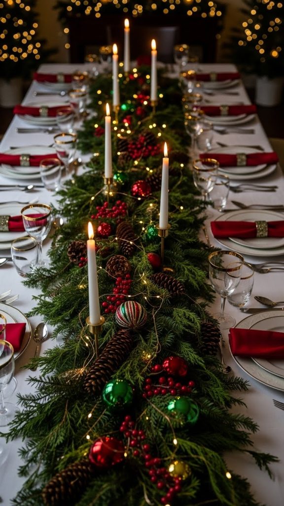 Start with a base garland made of fresh or faux evergreen branches. Lay it down the center of the table and gently fluff the branches to create volume. Add accents such as berries, pinecones, ribbon, or ornaments to enhance the design. You can also weave fairy lights through the garland for a warm glow.