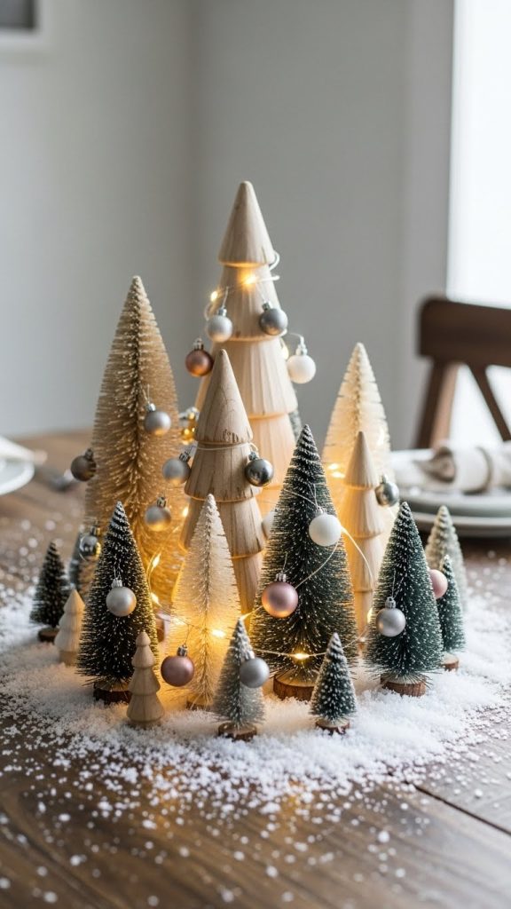 Miniature Christmas trees are charming, festive, and easy to style. This idea is perfect for people who want a centerpiece that feels joyful and traditional without taking up too much space on the table. Mini trees come in a variety of materials including bottle brush, wood, ceramic, or natural pine.