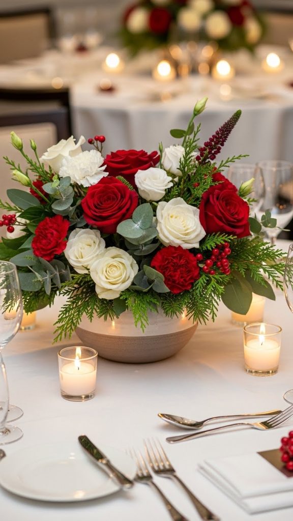 Fresh flowers make any table feel special. During the Christmas season, red and white bouquets create a timeless holiday feel that works with traditional, romantic, or modern styles. Using flowers as your centerpiece adds softness and elegance to the table, especially when paired with greenery and candles.