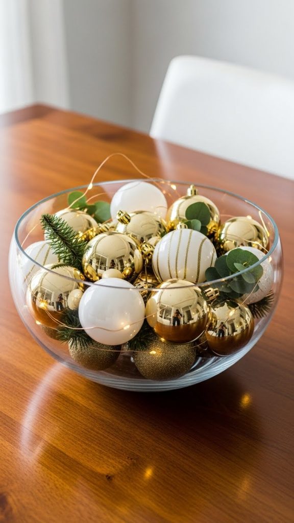 Once your ornaments are placed, fill in small gaps with greenery sprigs or artificial snow. You can also add fairy lights to bring subtle illumination to the display. This centerpiece works especially well on round tables, kitchen islands, or sideboards. If you prefer a minimalist style, stick to neutral ornaments like champagne, white, and soft gold.