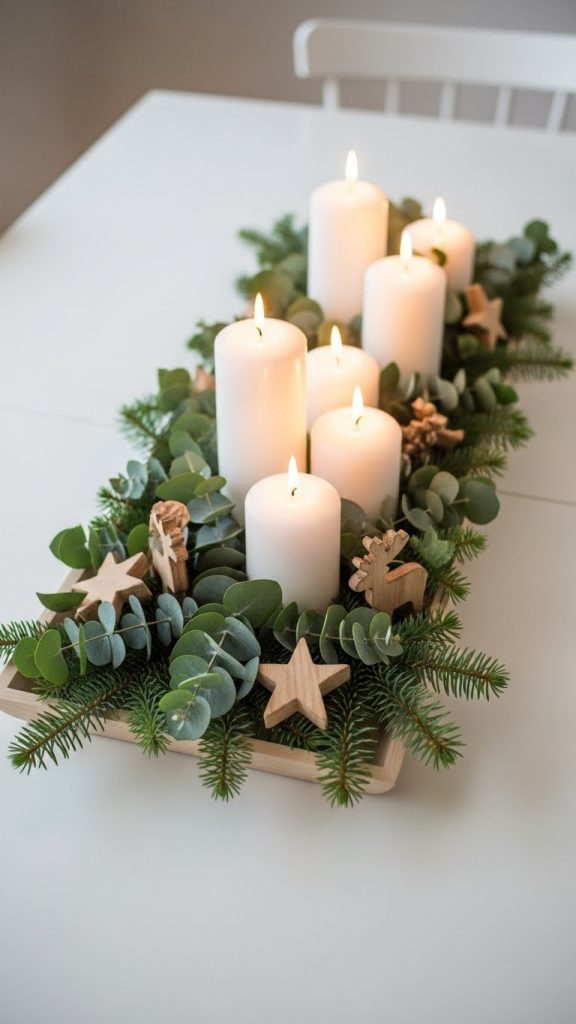 Begin with a long wooden board or a white ceramic tray. Place three to five white pillar candles in the center, spacing them evenly. Surround the candles with fresh or faux greenery in light, airy textures. Eucalyptus and spruce work especially well for this style.