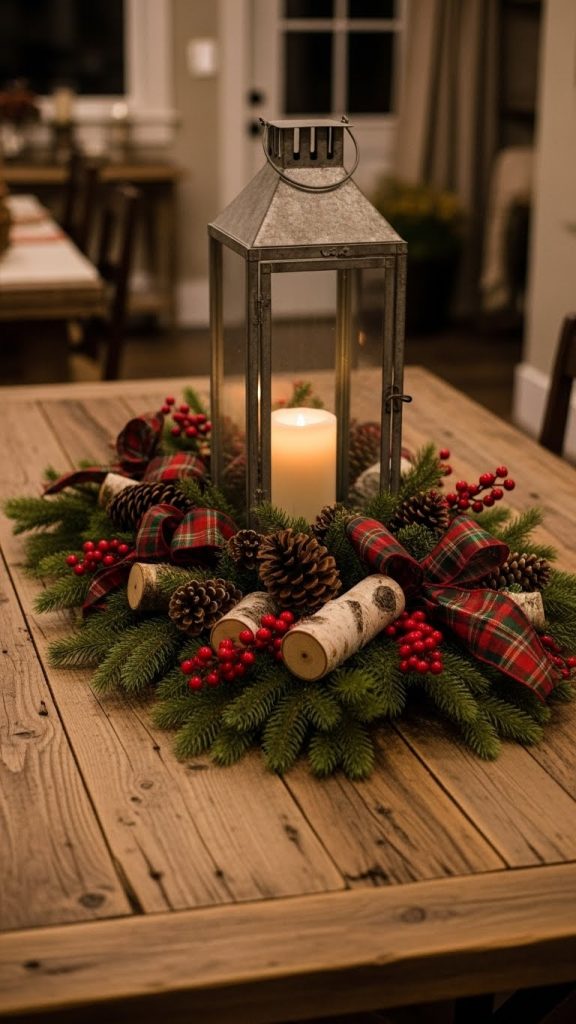 Select a large lantern made of wood, metal, or glass. Place a pillar candle inside or add battery operated lights for safety. Surround the lantern with greenery, pinecones, faux berries, or small decorative trees. If you want a more natural look, scatter birch logs or wooden beads around the base. For a more elegant touch, use gold or silver accents.
