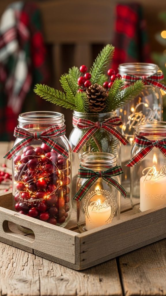 Choose three to five mason jars of varying heights and place them in a wooden crate, tray, or directly on the table. Fill each jar with different holiday themed elements such as fresh greenery, holly branches, cranberries, or fairy lights. You can also use mason jars as candle holders by adding tea lights or small pillar candles inside.