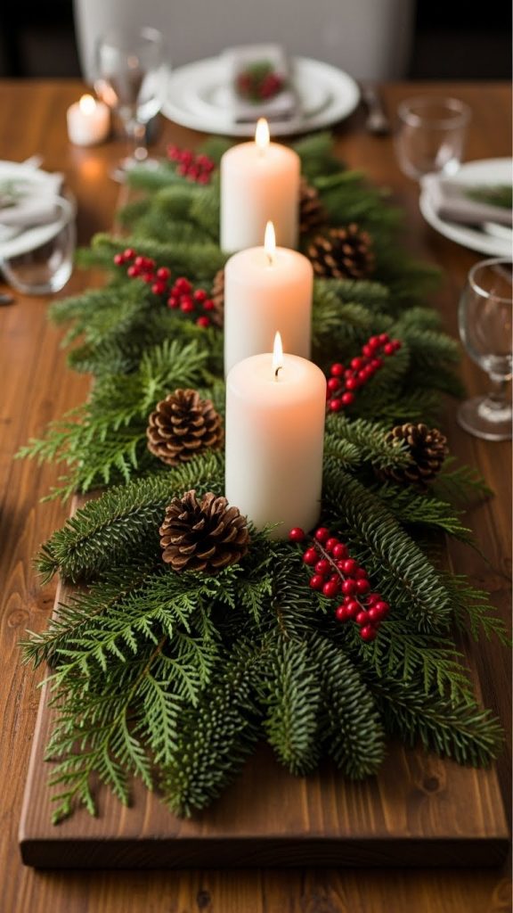 When most people picture a Christmas centerpiece, they imagine lush evergreen branches paired with soft candlelight. This timeless combination instantly adds a warm, welcoming glow to any table. The natural texture of pine or fir branches brings an authentic winter feel, while candles create ambiance that feels both intimate and festive.