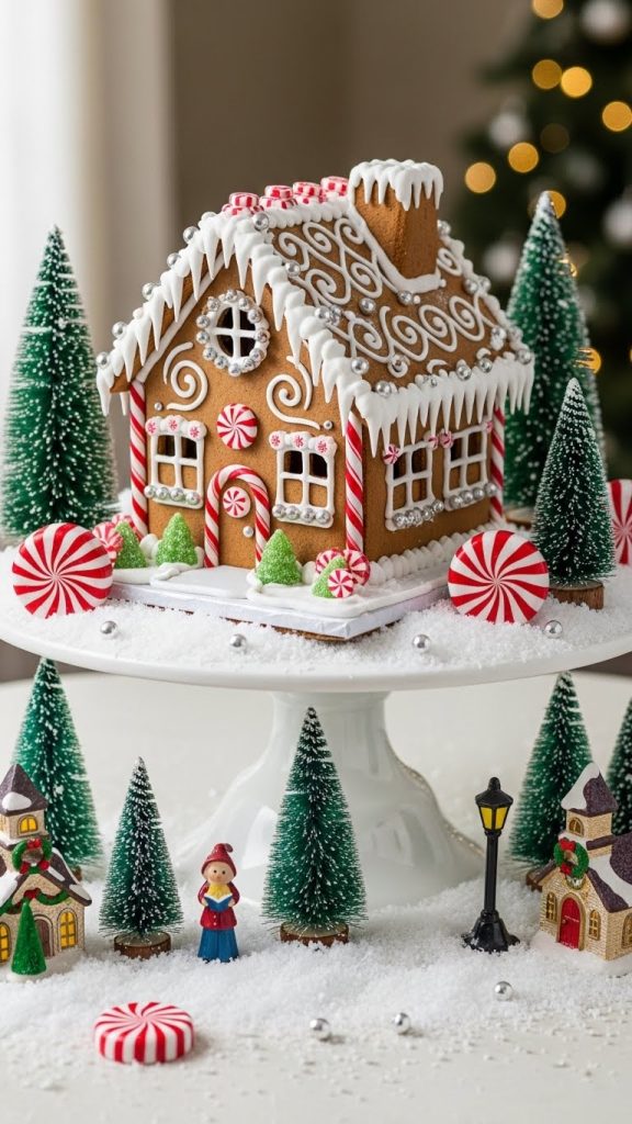 Select a gingerbread house that fits the scale of your table. Place it on a cake stand or decorative plate to create height. Surround the base with artificial snow, small bottle brush trees, peppermint candies, or wooden figurines to make a miniature Christmas village scene.