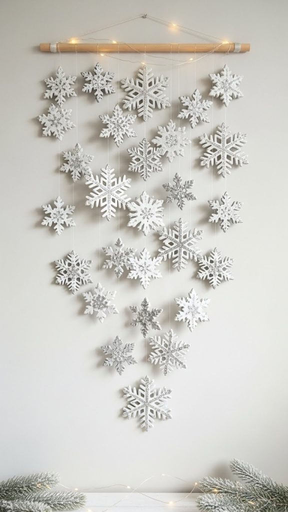 Once dried, paint them with white, silver, or gold accents to highlight the crisp winter theme. Tie them to a wooden dowel or branch to finish the wall hanging.