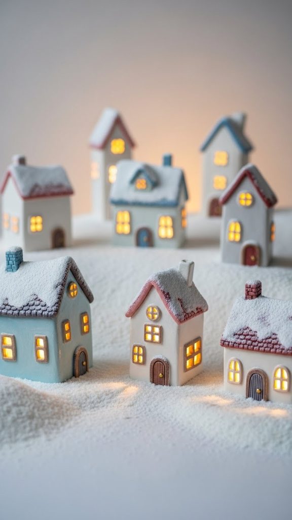 Mini Christmas villages are a beautiful and nostalgic part of holiday decor. Creating your own village houses out of clay makes a personalized and charming gift. These small houses can be sculpted with simple geometric shapes and decorated with windows, doors, roof shingles, brick textures, and snowy details.