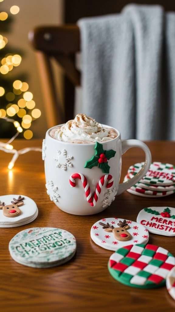 Alternatively, you can craft clay embellishments to glue onto plain mugs such as clay shaped gingerbread men, candy canes, or miniature Christmas lights. These transformed mugs make cozy gift items, perfect for hot cocoa lovers.