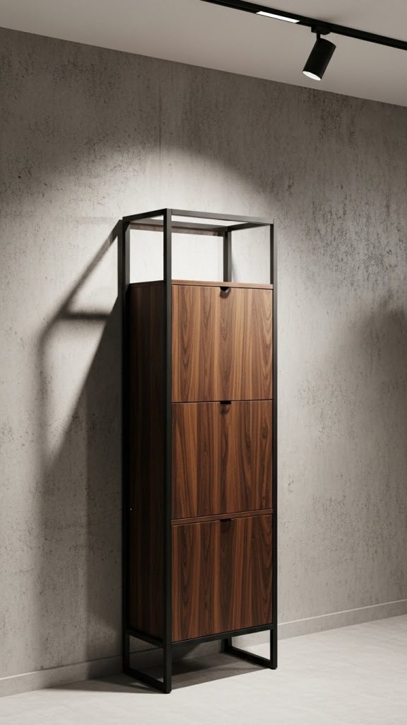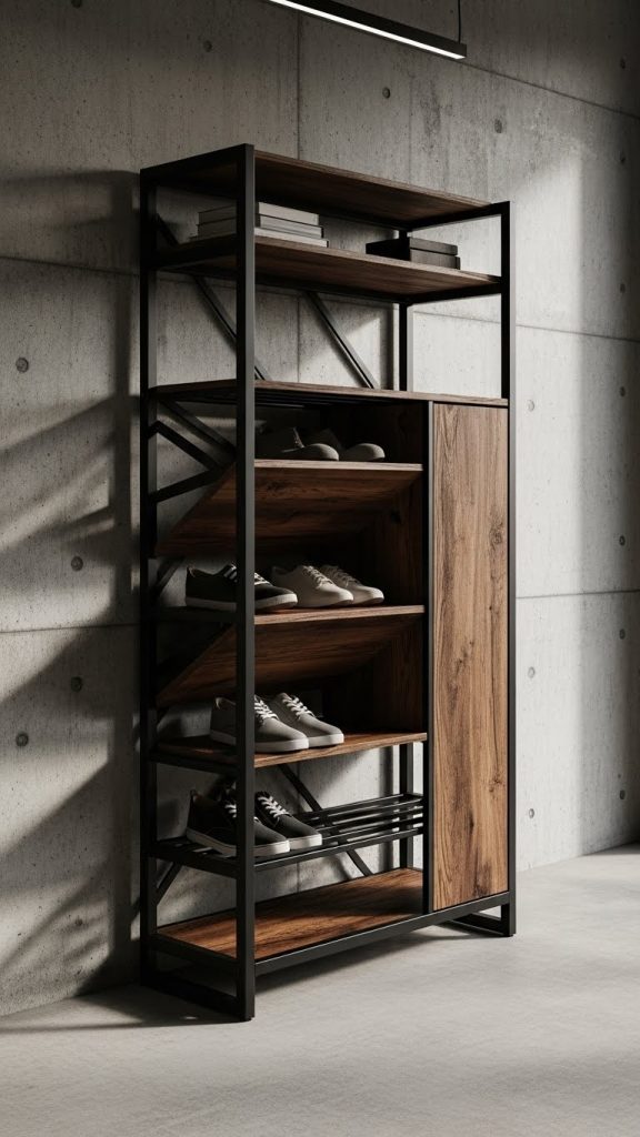 Industrial style closed shoe racks offer a bold and modern look. These designs typically feature metal frames combined with wood or dark laminate panels.