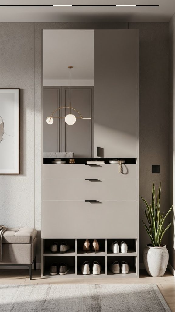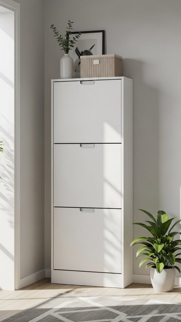 Slim shoe cabinets with flip down doors are especially popular in apartments. They can be placed behind doors, in narrow hallways, or beside entryway consoles. White, beige, or light wood finishes keep the space feeling open and airy.
