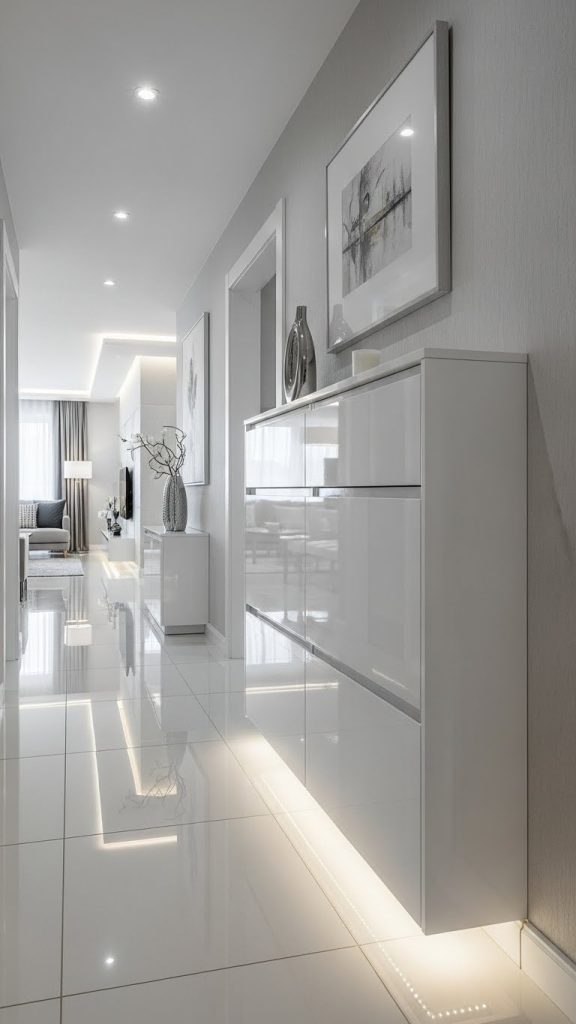 High gloss closed shoe cabinets are a popular choice in modern and contemporary homes. Their shiny surface reflects light, making small spaces appear brighter and larger.