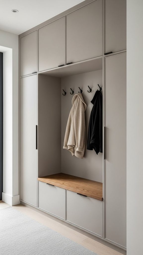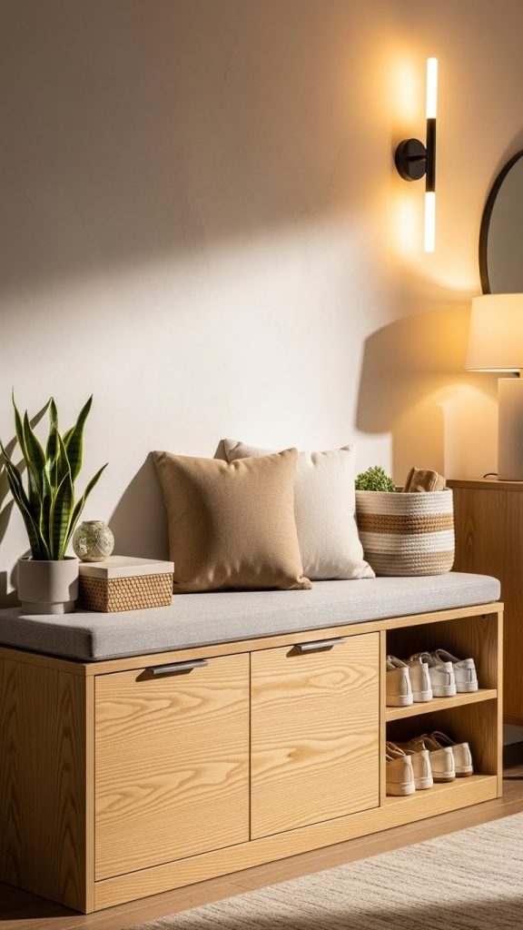 Upholstered benches in neutral fabric or leather add comfort and elegance. The closed storage below keeps shoes out of sight while maintaining easy access.