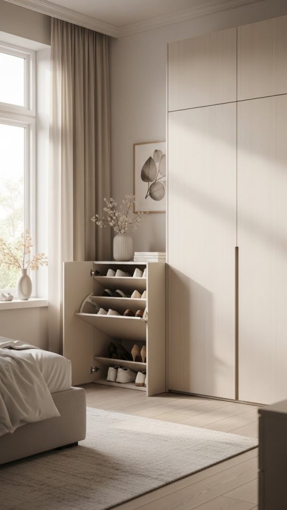 A closed shoe cabinet in the bedroom keeps footwear hidden and protects them from dust. It can be placed near the wardrobe or integrated into existing storage units.