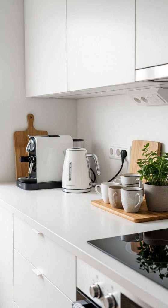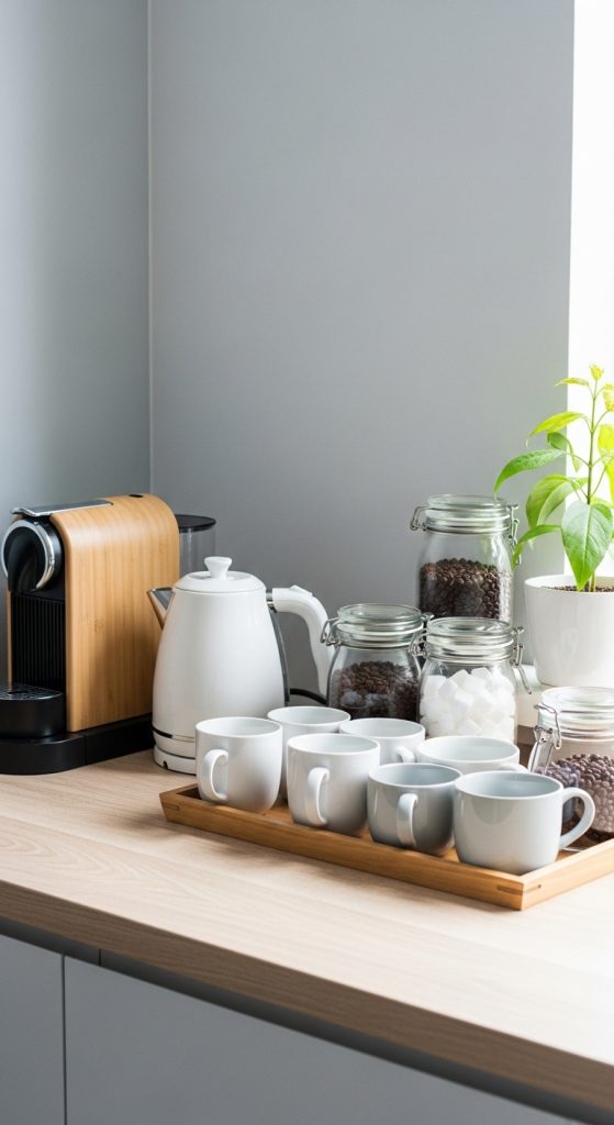 Use a sleek tray or small shelf to hold your essentials: a coffee machine, an electric kettle, a few mugs, and jars for coffee beans or tea leaves. Stick to neutral tones like white, beige, or gray for a timeless appearance. Incorporate a few natural elements such as a wooden spoon or small potted plant to soften the overall look.