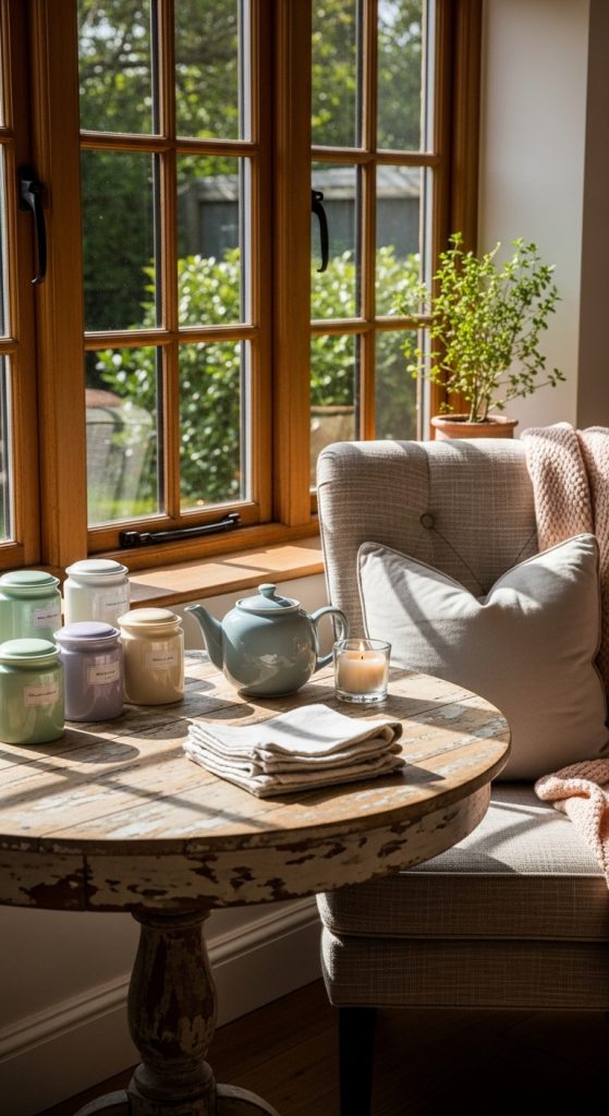 Use calming tones like soft green, beige, or pastel shades. Add a teapot, an assortment of teas in jars, a candle, and a comfortable chair nearby. This setup should invite you to slow down and unwind.