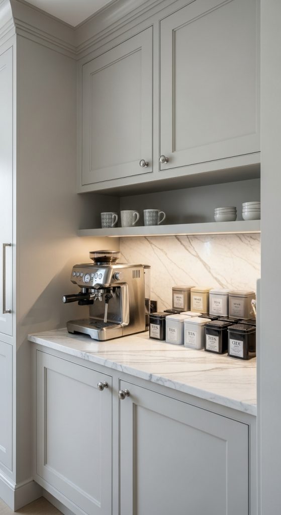 If you have space in your kitchen, consider turning a small corner or unused cabinet area into a built-in coffee and tea nook. This design makes your beverage station feel like part of the kitchen’s architecture.